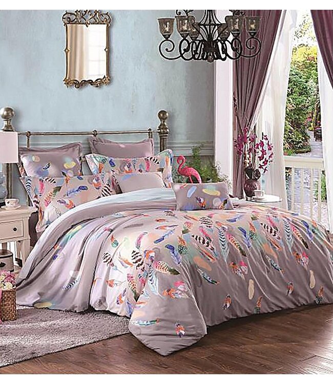 Breng een vleugje elegantie en speelsheid naar je slaapkamer met het Dommelin Piuma dekbedovertrek. Het delicate veertjesdessin in zachte, harmonieuze kleuren ligt op een subtiele lila-achtige achtergrond en geeft je bed een luchtige, stijlvolle uitstraling. Gemaakt van hoogwaardige 300-draads katoensatijn voelt de stof heerlijk zacht en luxe aan, voor een ultiem comfortabele nachtrust. Het dekbedovertrek wordt geleverd met een bijpassende kussensloop voor een complete, verfijnde look.